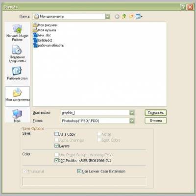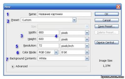 Создании нового документа Чтобы создать новый документ в Photoshop, можно просто нажать комбинацию клавиш Ctrl + N или выбрать в горизонтальном меню: File(файл)> New(новый). Появится диалоговое окно. 1. Имя документа - Здесь укажите имя документа (изображения). 2. Предустановки -Выберите размер документа из ранее установленных или... 3. Размеры документа - Здесь укажите ширину и высоту создаваемого документа самостоятельно. 4. Единицы измерения документа - Укажите единицы измерения документа (для типичных задач обычно выбираються пиксели). 5. Разрешение - Укажите разрешение документа. Разрешение обычно означает число точек (или пикселей) на дюйм. Для печати лучше выставить значение от 300, что также увеличит и размер документа. Тем не менее, для экранной работы или работы в web подходящее разрешение 72. 6. Цветовой режим - Укажите цветовой режим документа. Если только предвидется специальная печать, лучше всего работать в режиме RGB Color (Red/Green/Blue). 7. Содержание Фона - Укажите тип фона вашего документа. Сохранение и закрытие документа Photoshop Чтобы сохранить документ Photoshop, нажмите комбинации клавиш (или выбрать соответствующий пункт в горизонтальном меню - File): Ctrl + S - сохранить (save) Shift + Ctrl + S - сохранить как... (save as...) Ctrl + W - закрыть (close), будет предложено выбрать, сохранить изменения или нет. Стандартным форматом рабочих файлов Photoshop является расширение PSD. Это расширение расшифровывается как Photoshop Document и представляет из себя рабочий документ, к которому можно возвращаться и вносить изменения и доработки вашего проекта. Особенность его, что файл сохраняется по слоям, если открыть выпадающее меню Format, то Вы увидите список других форматов в которых можно сохранить документ. Но не все форматы поддерживают возможность сохранять документ по слоям и в будущем в проект нельзя будет вносить изменения. Практически можно, но это жутко неудобно и трудоемко, поэтому лучше хранить рабочие файлы в формате PSD. Конечно он требователен к размеру, и занимает не маленькое место на жестком диске, но старые проекты можно легко заархивировать, например в RAR. Он хорошо ужимаем и будет занимать гораздо меньше пространства на вашем диске. Закрытие документа происходить аналогично, через главное меню File>Close (Файл>Закрыть) или сочетанием клавиш Ctrl+W.